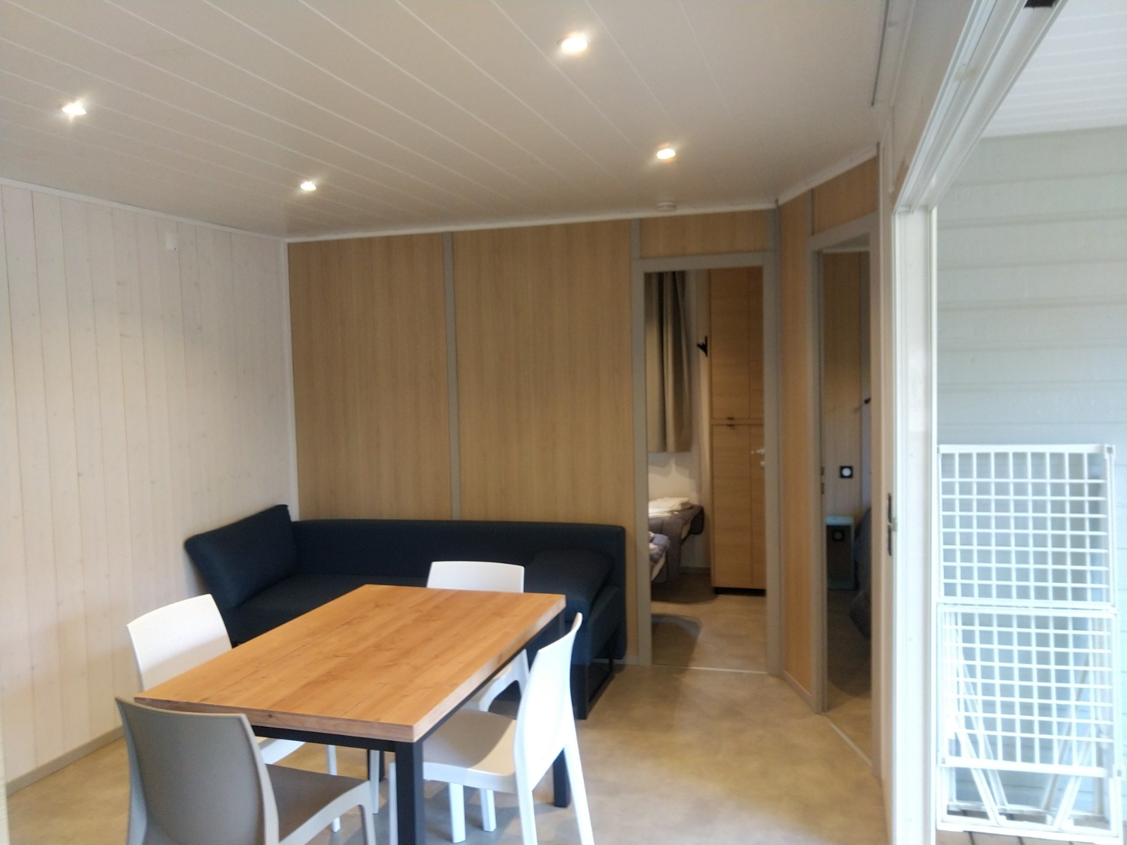 un vaste séjour/cuisine 2 chambres l’une « adulte » spacieuse disposant d’un placard de rangement et d’un lit en 140cm et l’autre plus petite pour les enfants avec 2 lits en 90cm pouvant aussi se rapprocher pour organiser le couchage d’un couple.